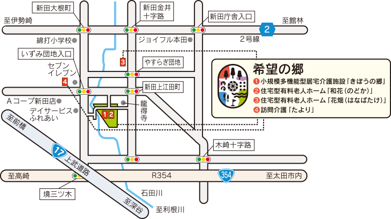 いずみ団地入口の信号を直進して、右側に赤い看板(デイサービスふれあい)が見えてきましたら、その先を左折し、石田川の橋を渡りますと赤い屋根の介護施設「希望の郷」が見えてきます。