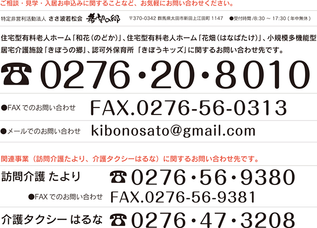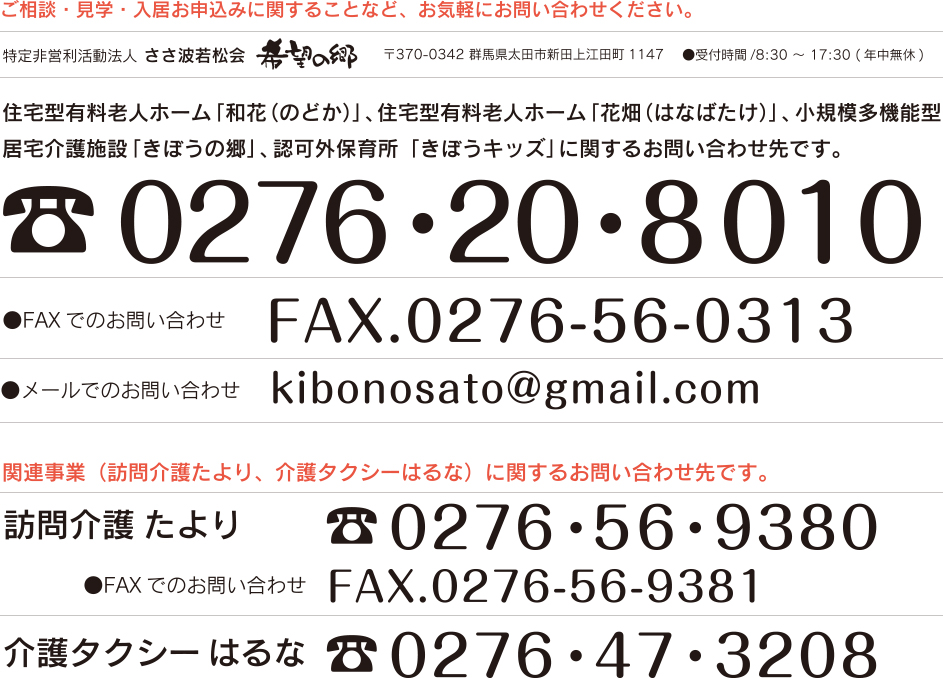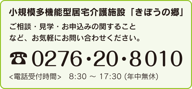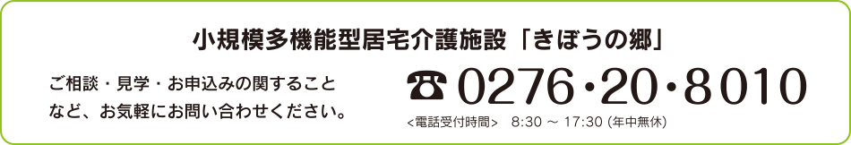 <電話受付時間> 8:30~17:30(年中無休) <小規模多機能型居宅介護施設きぼうの郷で随時受け付けております。お気軽にお問い合わせください。>